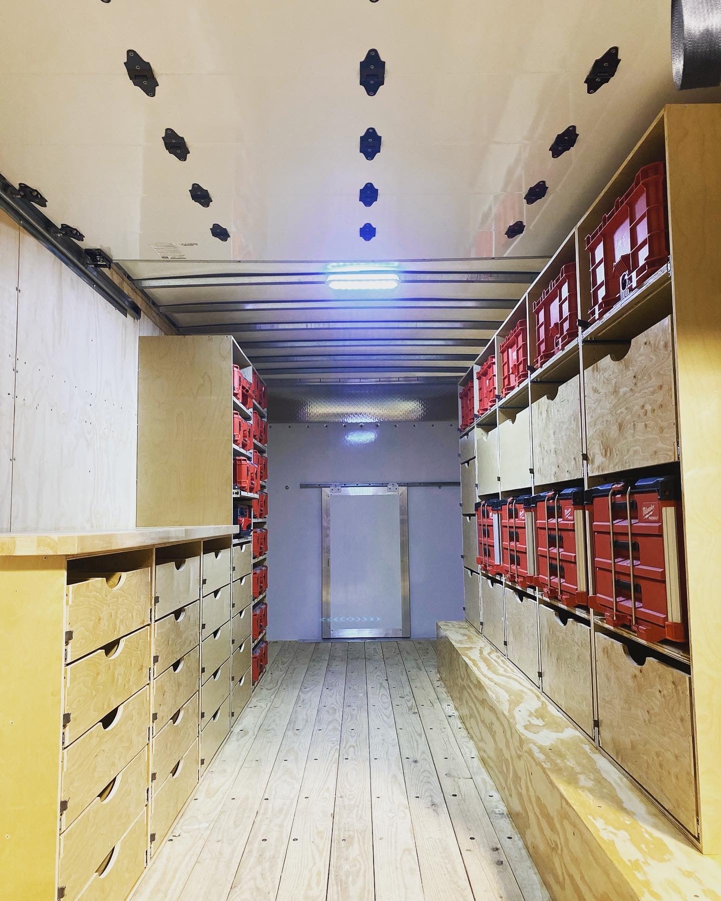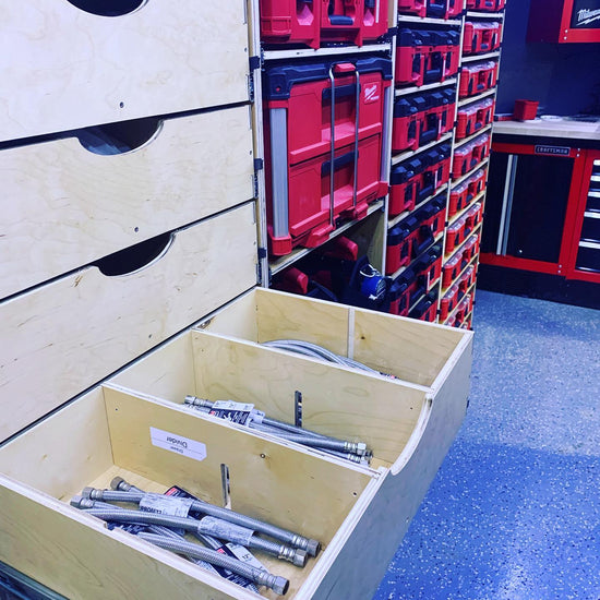 Another great angle of this trailer build. A sneak peak at the plumbing supplies in the STV Racking drawers. They are utilizing the included dividers to seperate the different parts and components.