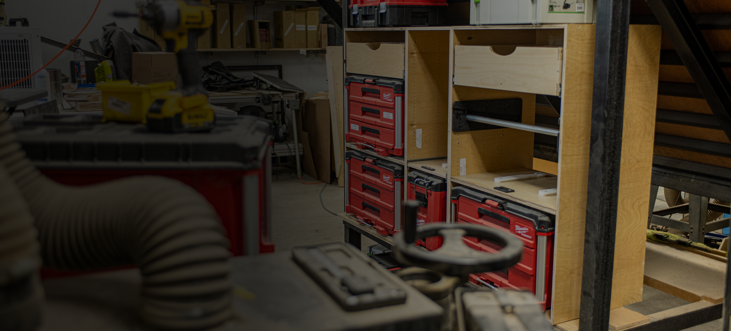 On the right side, we focused on storing larger tools and supplies. With a bunch of 12" drawers (all with dividers), the crew can stay organized.