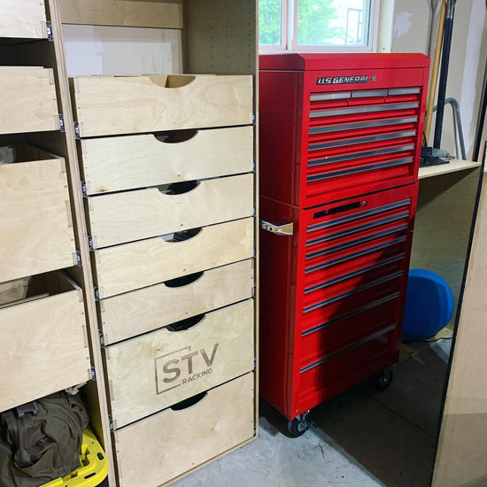 Kevin purchased our Shark-Loc and Torpedo Dock kits and built his own cabinets. This is a great example of using STV Racking components while saving money by building your own cabinets. He also beefed up the Shark-Loc system by adding metal plates to the cabinet side and drawer sides.