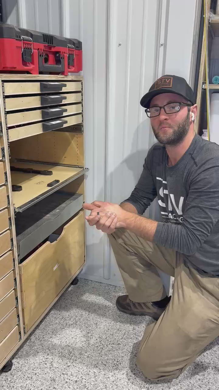 Tool containers and any other items shown in the pictures are not included. This product listing consists of the plywood racking tower, plates/trays, and drawer slides only.