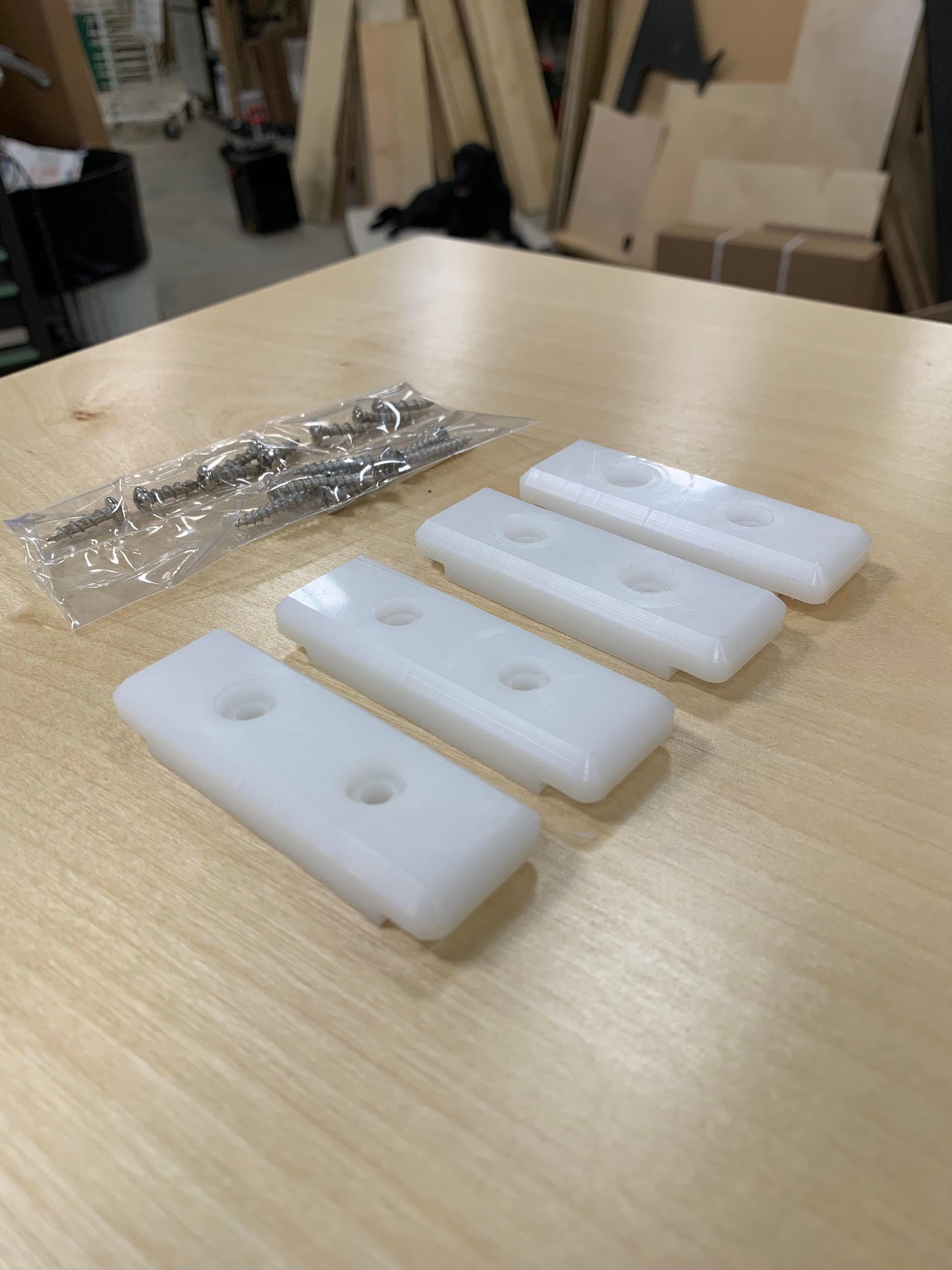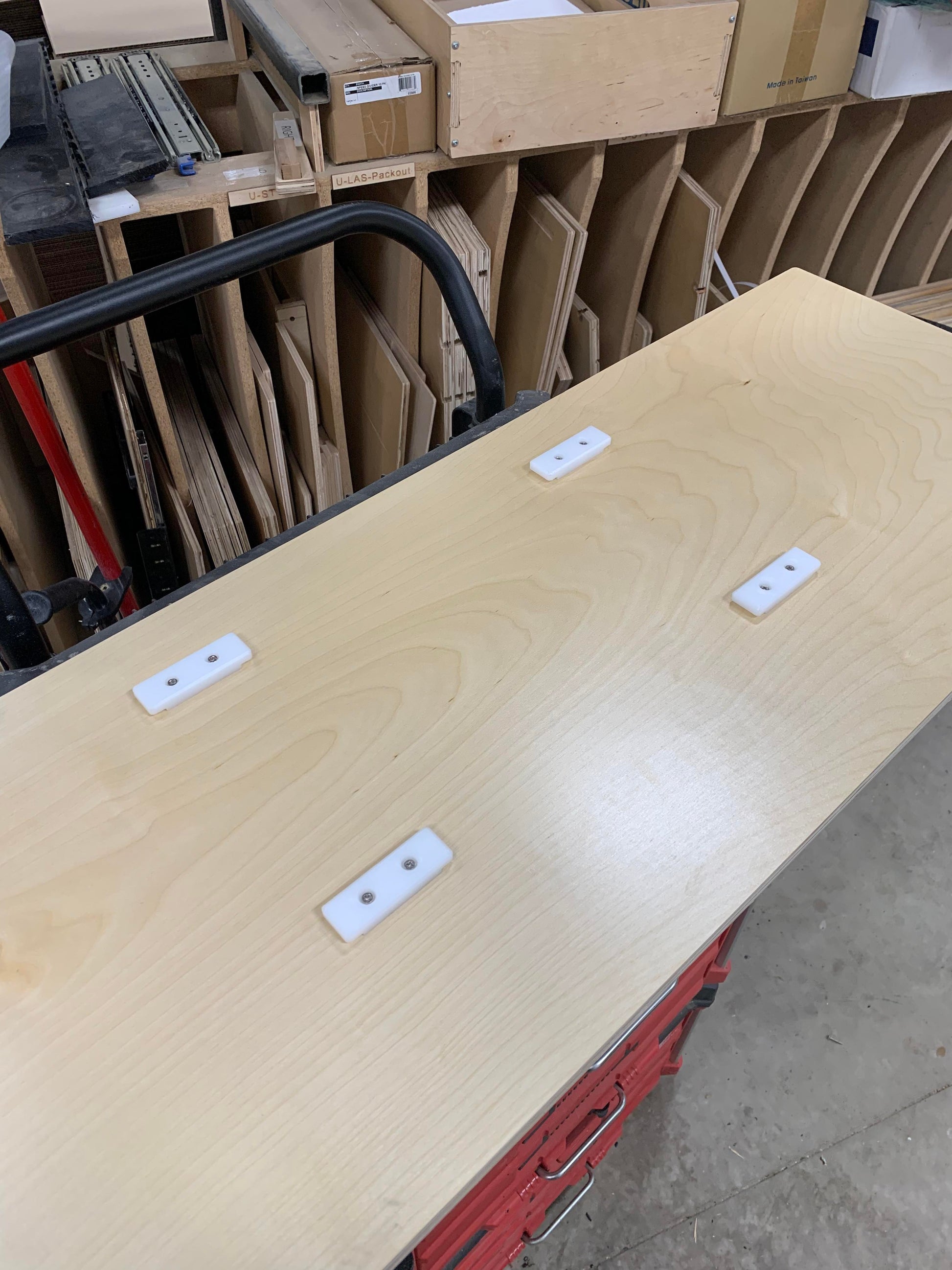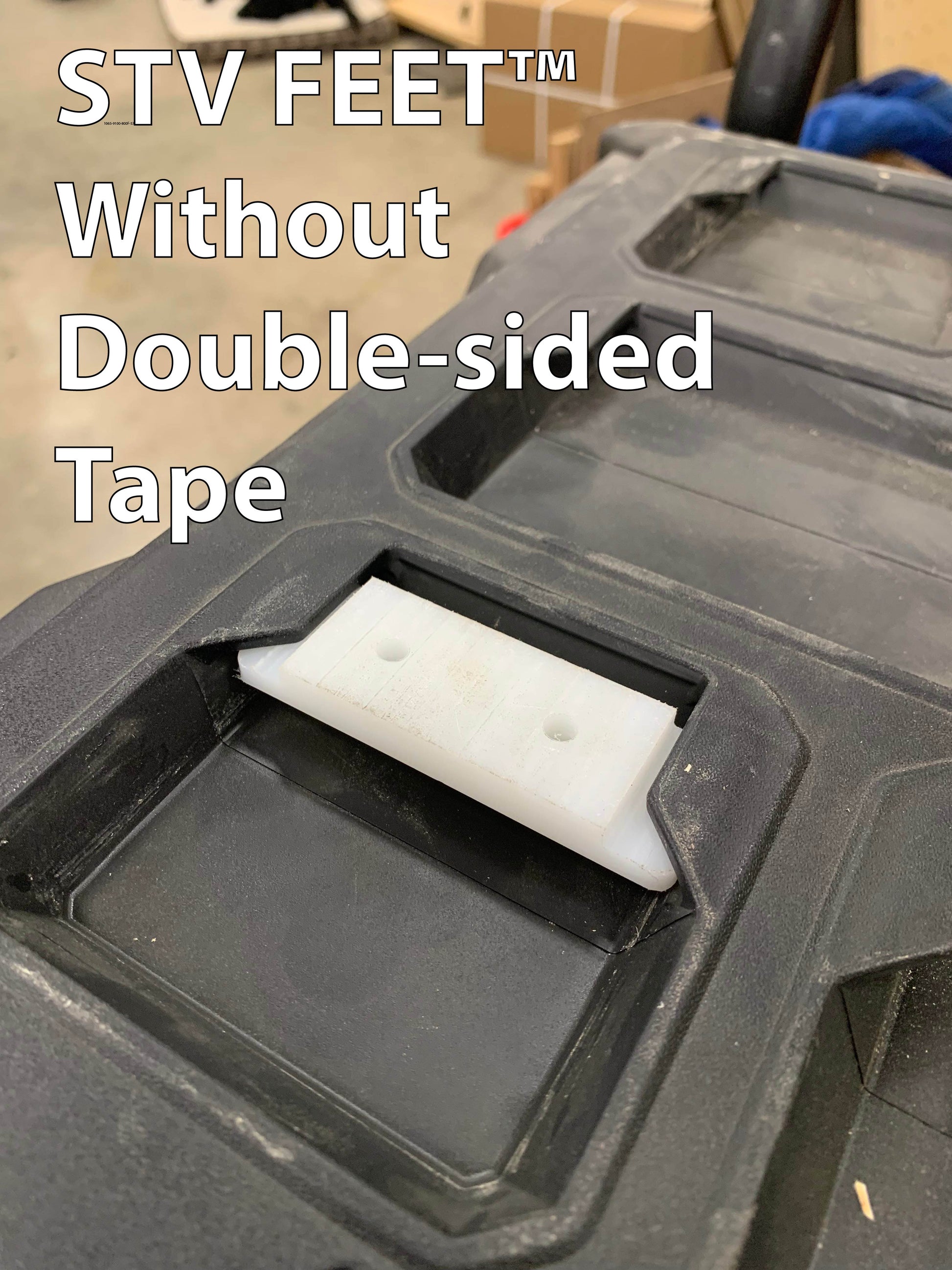 STV Feet™ allows you to connect almost anything to the top of a Packout Tool Box. Simply place the STV Feet™ into the top of the Packout Tool Box with double-sided tape. Then place whatever (plywood, different brand toolbox, etc) on top. Press hard on the double-sided tape. Slide out the STV Feet™ and drive the screws to secure to the desired item.